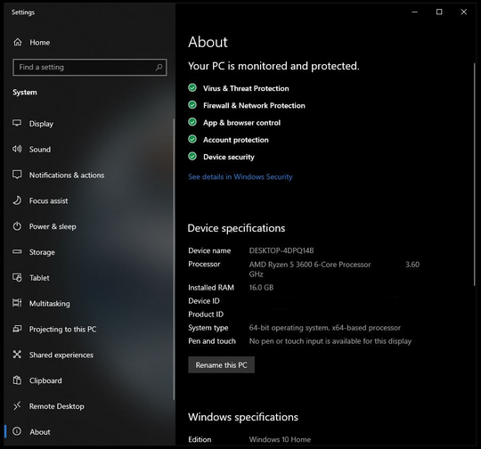 2. Scroll down to Device specifications.